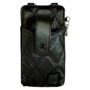 Water-repellent exterior, soft-lined main cellphone pocket with adjustable elastic snap closure, removable/adjustable crossbody strap, gift tag