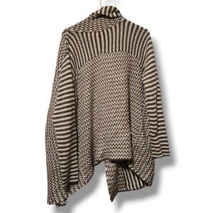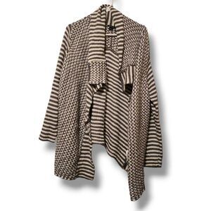 Cozy meets chic in this open front knit cardigan featuring a bold mix of neutral taupe and cream stripes with textured woven detailing. Designed with a draped waterfall front and relaxed fit, it’s the perfect layering piece for effortless style and comfort. Striped sleeves ** Soft midweight knit makes it versatile for cool weather, whether paired with jeans and boots for casual days or dressed up over a sleek top. A timeless neutral palette ensures it complements any wardrobe.