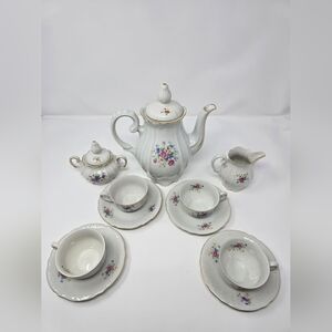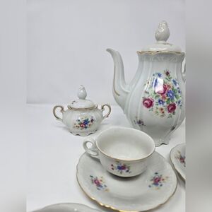 This exquisite 13-piece porcelain tea set from IJB Germany US Zone is a true collector's item. The set includes 4 cups and saucers, a creamer, and a sugar bowl, all adorned with a beautiful floral pattern and gold trim, and pitcher. The round shape and large size make this set perfect for all occasions, and the hand wash only care instructions ensure that it remains in pristine condition for years to come.