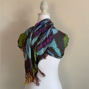 Gorgeous 100% silk vibrant scarf with Ikat pattern. Features shades of blue, purple, brown and greenish yellow. 15 in. wide. 68 in. long. In great condition. So versatile- can be worn in endless ways.