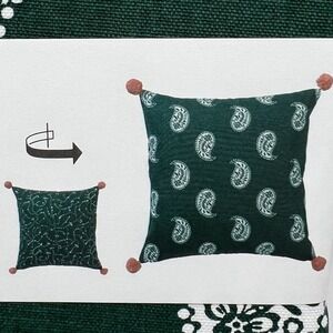 "Green cushion cover in cotton with corner tassels, a paisley pattern on one side and playful dots on the other. Part of the AROMATISK collection where you will find matching textiles and decorations."