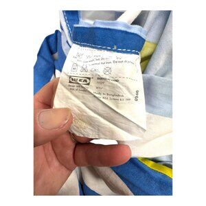 This charming duvet cover features a whimsical parade of zoo animals including giraffes, lions, and monkeys set against bold horizontal stripes in blue, yellow and white. Made from 100% cotton, it combines playful design with IKEA's signature Scandinavian quality.