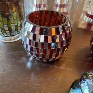Really beautiful! The mosaic candle holders are old and in great shape! Four total. The IKEA glass tree ornaments are new in their boxes, four total. The blown glass tree ornament is solid and gorgeous! This is a beautiful lot of different things to add color and beauty to your holiday!