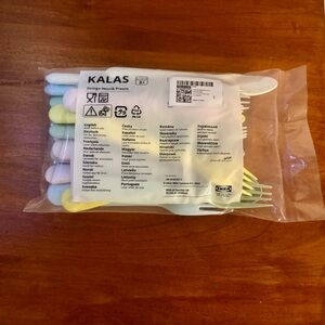 Add a touch of color to your child's dining experience with the IKEA KALAS Flatware Pastel Mixed Colors. These flatware are perfect for little ones learning to feed themselves and are made from high-quality materials to ensure durability. The vibrant pastel colors will make mealtime more enjoyable and the spoons are easy to clean, making them a practical addition to any kitchen. Ideal for babies and young children, these spoons are a must-have for any parent looking to add some fun to their dining routine. Total of 6 spoons, 6 forks & 6 knives- (Width: 3 ¾ " Height: ¾ " Length: 6 ¾ ") -