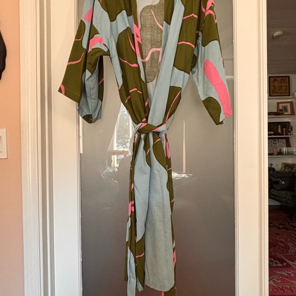 Stylish kimono robe with a vibrant design. Features green, pink, and light blue colors. Perfect for a chic and comfortable look.
