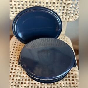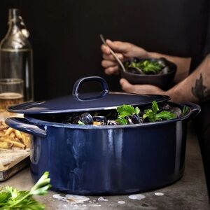Rare and discontinued IKEA VARDAGEN enamel steel pot with lid in deep navy blue. This versatile Dutch oven–style casserole dish combines timeless farmhouse style with durable everyday function. Perfect for both cooking and serving.