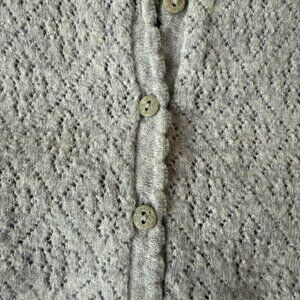 This boutique-quality set includes a soft light gray knit sweater with button front and a cream ruffle skirt with embroidered detail.