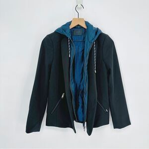 IKKS One Button Blazer With Detachable Hood in Black and Navy Blue. Size 36 or Small. Preowned condition. Please refer to photos for any signs of wear.