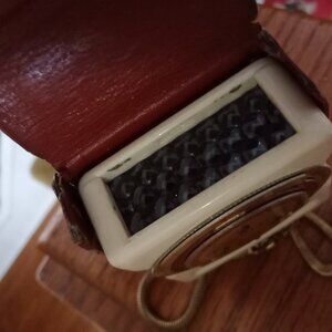 Vintage '60s...IKOPHOT light exposure meter...by Zeiss Ikon of Stuttgart, Germany...3 1/4" long X 2 1/4" wide X 1"deep...has the original brown, distressed leather case...attached to a brass toned 12" snake chain...pre-loved in good workable condition.