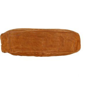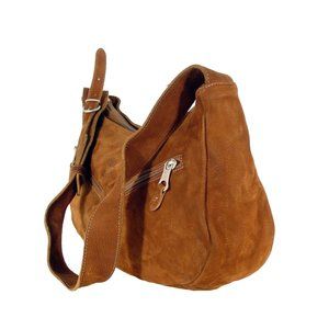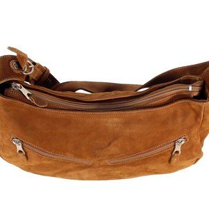 Rare suede hobo bag from Il Bisonte by Wanni di Filippo. This large shoulder bag is a deep, rich shade of tan that will always be in style. Angled front zip pockets for small items and a large inner zip pocket. Canvas lining. Roomy main compartment. A beauty! Comes with authenticity card.