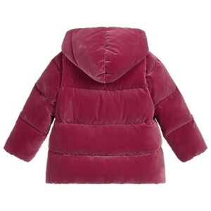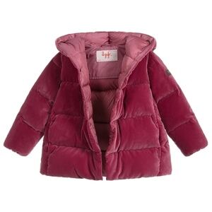 Double-breasted pink puffer down jacket for girls by Il Gufo. Made in beautifully soft velvet, it is padded with luxurious down and has a silky pink lining. There are useful concealed pockets on the side seams.