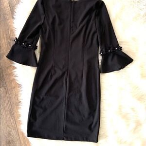 I LE NEW YORK Pearls Beaded Bell Sleeve Solid Dress Size 8. Very flattering black dress. Beautiful ruffle at end of sleeves decorated with flowers and pearls. Measurements: length 37”, bust 40”, hips 42, waist 34”. Stretchy. Condition is New with tags.