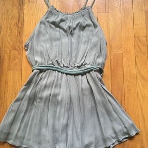 Illa Illa slate blue/gray romper. Romper is very unique and has a greek goddess toga type look and feel. Top has a mesh piece underneath with a light flowy overlay with a loose rope around the waist.
