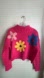 Brighten your wardrobe with this vibrant pink sweater featuring colorful floral designs. Perfect for adding a playful touch to any outfit.