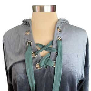 ILLA ILLA Gray Velvet Lace Up Hoodie Size L Plush Warm Cozy Lounge Athleisure. Banded cuffs and hem. Sadly, no pockets. Green twill lace with large grommets.