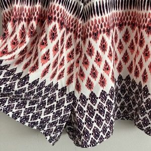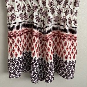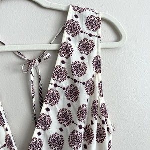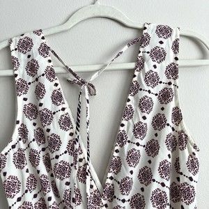 ILLA ILLA Womens Sleeveless Short Romper White Pink Tie Back Size Large. Illa Illa women's short romper. One piece. Deep v-neckline and deep v back. Tie back. Cinched waistline with elastic. Ivory base with coral or salmon pink and dark gray design. Size large. Measured laying flat: Measures 17" from armpit to armpit. Measures 13.5" at waist. Waistline is elastic so it stretches. Inseam of shorts is 3".
