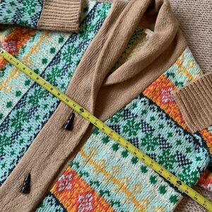 Size M/L ILLA ILLA Vibrant knit cardigan featuring a mix of patterns. Includes a button closure and ribbed cuffs. Perfect for adding color to your outfit.