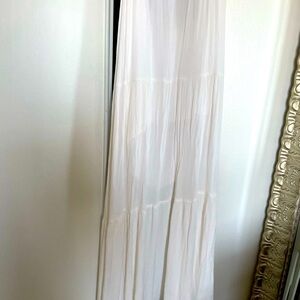 Chic adjustable strap maxi dress with ruffle accents, keyhole front, exposed sides and open back. Lightweight and stylish for any event.