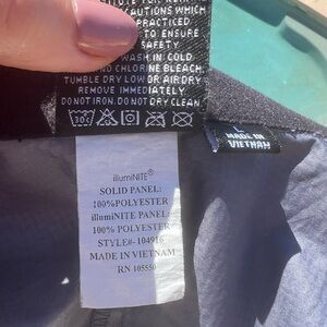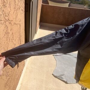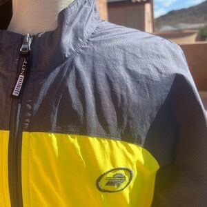 This windbreaker jacket is in excellent condition with two front pockets that have zippers to hold important items such as keys and ID while exercising. The back ventilation flap has a zipper for your comfort. The back opening also has ventilation flaps for cooling while exercising. The gray and reflective neon yellow solid panels are made of 100% polyester and lightweight. It is also made of recycled polyester, is reflective and folds into itself, becoming very small and easy to pack. The price has been reduced by 10% for a few grass stains on the front of the jacket shown in the pictures. Smoke free home. Excellent used condition.