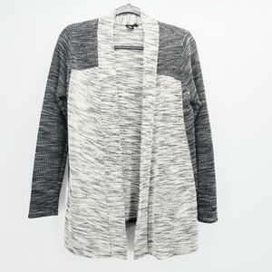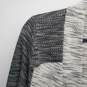 Open front black and grey cardigan with woven like design. Cardigan has pockets. Pit to pit 18" Length 31" Condition is pre-owned with no flaws. F.CS CC25