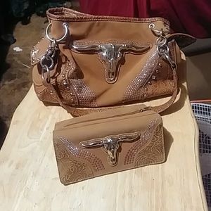 IM SELLING THIS BEAUTIFUL WOMEN'S WESTERN LEATHER PURSE IN LIKE NEW CONDITION I WOULD SAY ITS MEDIUM SIZE AND COMES WITH MATCHING WALLET SELLING AS A COMBO PURSE AND WALLET