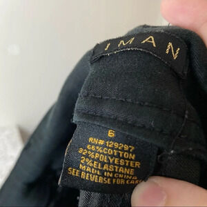 • Cotton blend black bootcut slimming pants with slimming interior panel, double button up. Metal logo tag on back pocket.