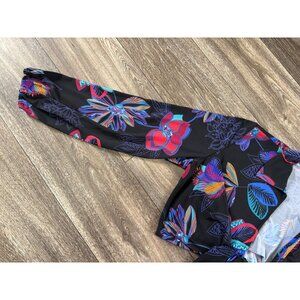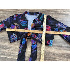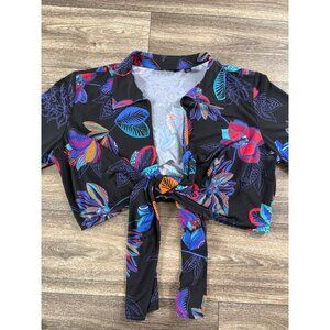 IMAN CASUAL BLACK FLORAL TIE FRONT CROPPED TOP LONG SLEEVE COLLARED WOMENS XLP