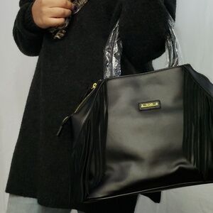 GORGEOUS GENUINE LEATHER SATCHEL WITH FRINGE DETAILS AND CROSSBODY STRAP BY IMAN GLOBAL CHIC.