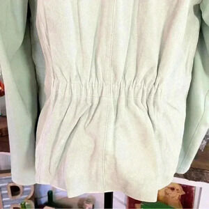 This is a beautiful new with tags IMAN suede and ponte jacket in mint green. Can cinch waist with a drawstring. Gold hardware. Includes coordinating scarf.
