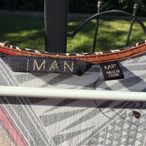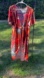 Chic high low duster with a striking geometric pattern. Features vibrant red and brown hues. Ideal for stylish outings.