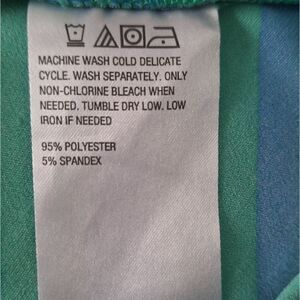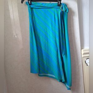 Iman Large striped blue/green Jade Ocean jersey, asymmetrical stretch, front part, pretty scarf belt detail, gold tone buckle, 32" waist, 25"-30" long