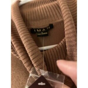 The IMAN Women's Global Chic Turtleneck Sweater in caramel is a classic and stylish piece perfect for various occasions such as travel, casual outings, workwear, and business meetings. Made from a rayon blend with rib knit styling, this sweater features long sleeves and button accents on the cuffs for a sophisticated touch. With a turtleneck neckline and a comfortable regular fit, this sweater is a versatile and chic addition to any wardrobe, fitting size L and suitable for the winter, fall, and spring seasons. Hand wash only . Never worn. 80% Rayon 17% Nylon 3% Spandex. Length Front 26 length back 28 Arm to armpits 19% sleeves 24. This Ian Global Chic Turtleneck sweater is a great staple for any womens wardrobe. The back hem is longer and this sweater has a ribbed pattern and knit. The color is beautiful. Thank you for looking!