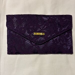 Elegant purple lace clutch. Features a sleek design. Perfect for evening events.