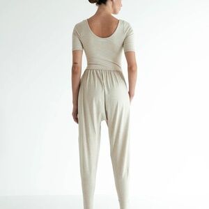 Super cute and comfy jumper from IMBODHI in excellent condition with no flaws or signs of wear—only worn 2-3 times at home. I would say it runs true to size or slightly large. It's very stretchy and compressive in the top and roomy in the hips. I'm usually a small or medium in tops and got this in a small (fits like the model). Perfect for fall layering!