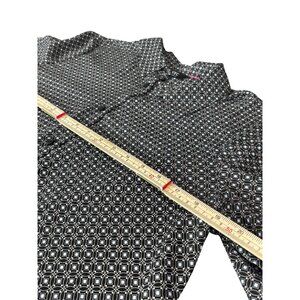 This button-up blouse from IMNYC by Isaac Mizrahi combines elegance with comfort. The intricate geometric pattern adds a stylish touch to your workwear wardrobe. Its tailored fit and lightweight polyester fabric provide a breathable feel, perfect for busy professionals seeking a polished look.