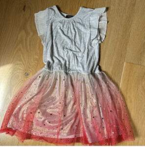 Multi media dress with solid body, pleated chiffon sleeves with ombré skirt attached with gold foil