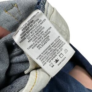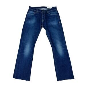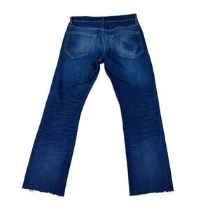 Dark wash distressed blue denim jeans from Imogene and Willie in size 26. These have been cut off at the hems as shown to feature a raw hem and ankle fit. THe distressing/wash in the denim is how they are made.