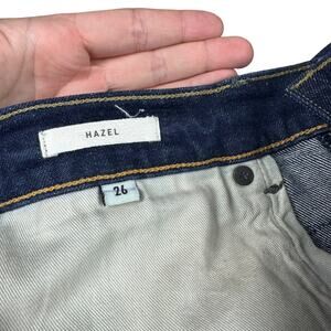 Features button fly, pockets, frayed hems, dark wash, Hazel style.