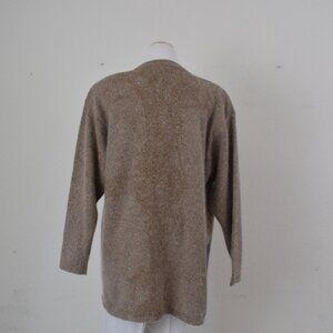 Imperfect 80s/90s silk blend vintage knit sweater/cardigan. Condition good, some part of the fabric in the back and on the back of the left arm seems a different shade. In my opinion it does not look disastrous or odd. It kinda loos variegated. The knit is not damaged in any other way.