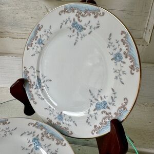 IMPERIAL SEVILLE CHINA 6 1/2” ROUND BREAD PLATES. SET OF 4. WHITE WITH BLUE FLORAL DESIGN & GOLD TRIM. IN EXCELLENT CONDITION. ANY IMPERFECTIONS ARE FROM MANUFACTURING.