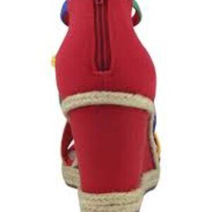Unique rainbow colored crisscross straps decorate the vamp of a wedge espadrille sandal. . Open toe. Stretch elastic crisscross vamp. Back zip closure. Cushioned Memory Foam footbed. Rope and canvas covered platform wedge heel. Approx. 3" heel.