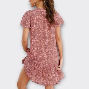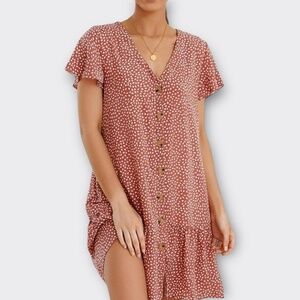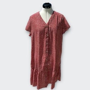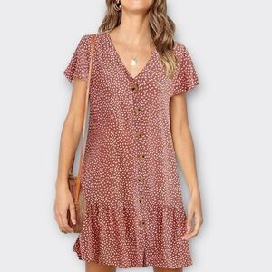 IMYSTY Women Polka Dot V-neck button front Ruffle casual midi dress Red Bean L