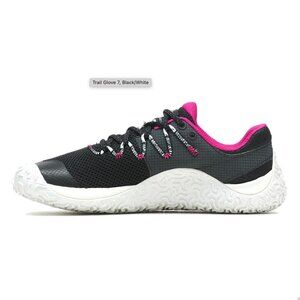 Gorgeous and comfortable pair of near new Trail Glove 7 trail runner walking and hiking shoes by Merrell. In box. Worn once. Can see from photos, no wear on the shoe, just a little dust on the soles. These are a size 9. Super cute black with pink and white accents. I love them but they're just a hair too small on me, otherwise I'd keep them.