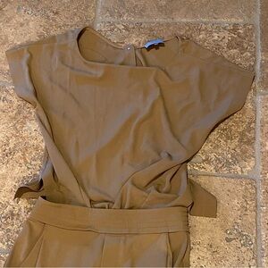 Pre-owned in great condition with no rips but has some light stains on the back by the zipper as shown in picture. Women’s crepe tan one piece jumpsuit. Open back and has zipper closure on the back. Also buttoned top on the back. Very elegant and sophisticated one piece. Nice neutral color. Comes from smoke and pet free home.