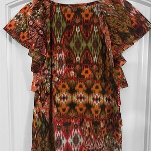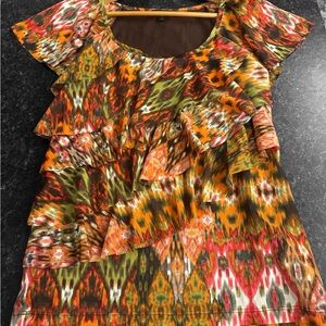 Beautiful colorful ruffled top. Oranges, greens and brown with multi layered look. This is a blouse that is very slimming. Elastic material.