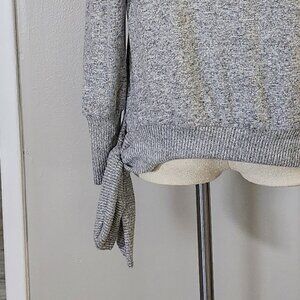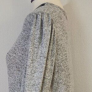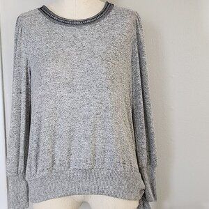 WOMENS I.N. STUDIO SUPER SOFT SWEATSHIRT/ EMBOSSED CHAIN LINK COLAR/ ARM CUFFS AND HEM BANDS/ GREY/ SIZEPL/ GATHERS AND TIES AT SIDE/ EXCELLENT CONDITION/ GATHERS AT SHOULDER