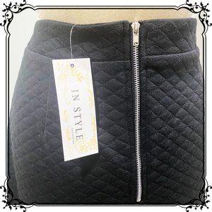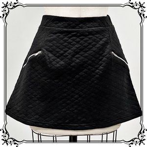 Style: Black Quilted; A-Line Mini Skirt; 2 Front Zipper Pockets; 8.25 in. Back Zipper