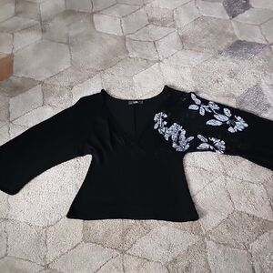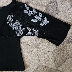 This chic black blouse by I.N. San Francisco features an asymmetrical design with a striking white floral pattern on the shoulder, adding a touch of elegance. The 3/4 sleeves and scooped neckline offer a relaxed yet stylish fit, making it a versatile addition to any wardrobe.