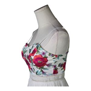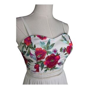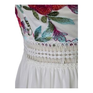 This I.N. San Francisco fit-and-flare mini dress is a fresh, feminine statement piece perfect for spring, summer, and special occasions. Featuring a sweetheart neckline, adjustable spaghetti straps, and a beautifully embroidered floral bodice in vibrant pink, fuchsia, turquoise, and green, it’s a head-turner from every angle. The waistline is accented with delicate open crochet lace trim for a touch of boho charm, while the flowy white chiffon skirt adds movement and elegance.