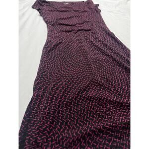 Sleek and stretchy vintage dress with a bold pink dash pattern on a black background. Features a flattering fitted silhouette and slight cap sleeves — perfect for a night out or adding some retro edge to your wardrobe. Soft, comfortable fabric with lots of stretch.